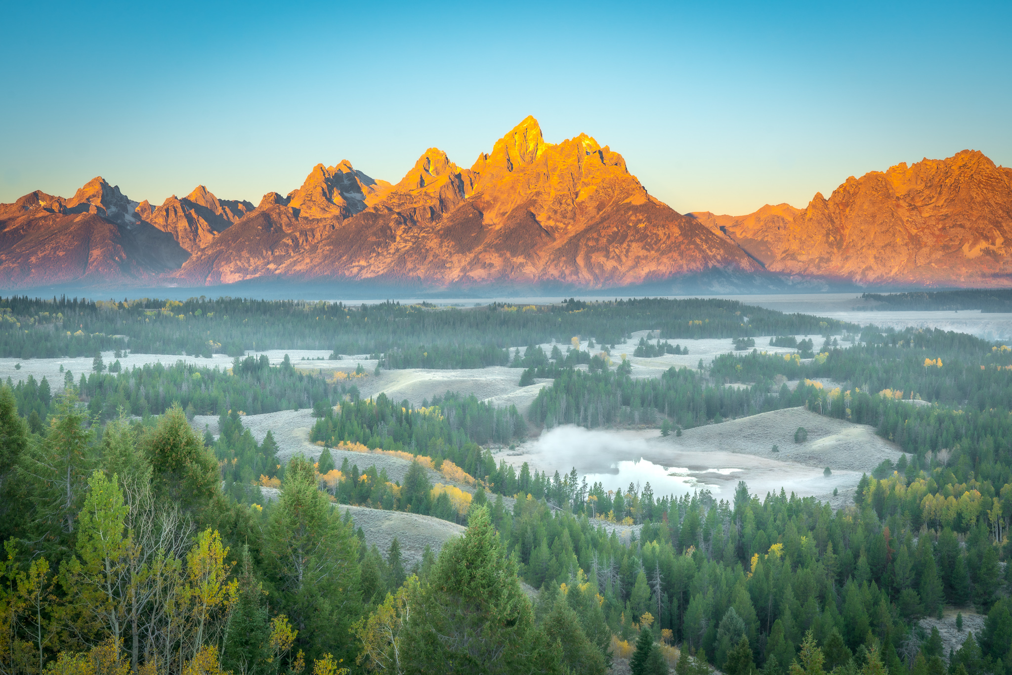 Après le petit-déjeuner, nous nous rendrons vers un point de vue pour assister au lever de soleil prévu à 6h30. Ensuite, nous explorerons l'Upper Geyser Basin, un véritable paradis pour les amateurs de géologie. Il abrite la plus grande concentration de geysers actifs au monde, avec environ 150 sources. Certains d'entre eux peuvent être prévus à des moments précis, calculés par les scientifiques et communiqués quotidiennement au Visitor Center. Nous aurons l'occasion d'admirer des geysers emblématiques tels que Old Faithful, avec ses éruptions régulières, ainsi que Grand Geyser, Riverside Geyser, Castle Geyser, Daisy Geyser, Morning Glory Pool et bien d'autres sources, toutes aussi photogéniques les unes que les autres.